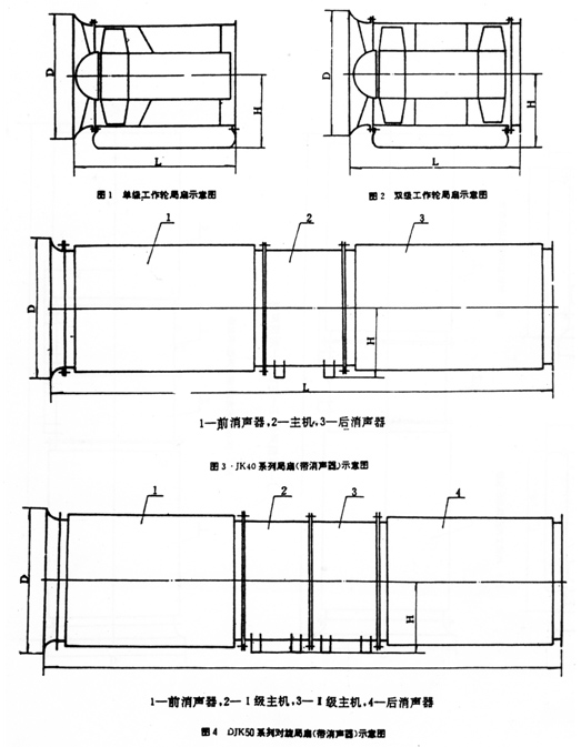 JK系列局扇的設計,綜合考慮了各類局部通風作業(yè)面所需的排塵排煙風量、風筒送風距離、常用風筒規(guī)格、風阻值,以及礦井內(nèi)的使用條件等。JK系列局扇分為單級工作輪JK-1NO.(參見圖1)、雙級工作輪JK-2NO.(參見圖2)和對旋運轉(zhuǎn)DJK等三類。JK40系列局扇(帶前、后消聲器)的機構(gòu)參見圖3,DJK系列對旋局扇(帶前、后消聲器)的結(jié)構(gòu)參見圖4。其中JK40系列局扇和DJK50系列對旋局扇可以直接安裝在巷道底板上,也可以懸掛安裝在巷道的幫壁上或頂板下。